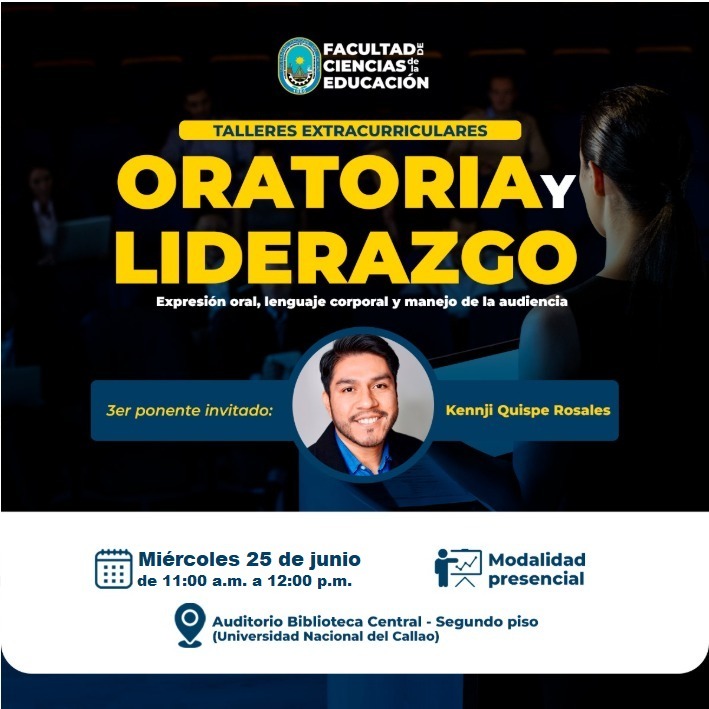 Estudiantes de la Universidad Nacional del  Callao Los invitamos a participar en la segunda sesión del Taller Extracurricular de “Oratoria y Liderazgo” 🎤🏅, que se realizará el miércoles 25 de junio, con la ponencia del Consultor en Change Management, KENNJI QUISPE ROSALES. 🆓 Taller gratuito […]
